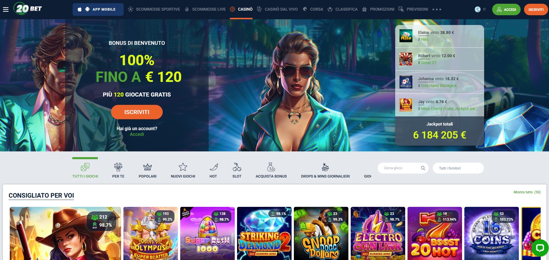 • Bonus di benvenuto: 100% fino a €120 + 120 giri gratis sul primo deposito (requisiti di scommessa: playthrough 40x).