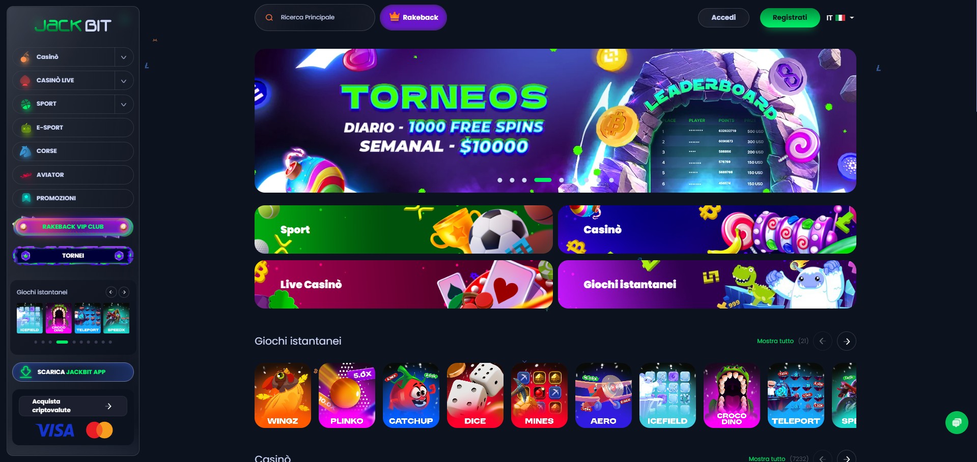 Jackbit è una piattaforma che mira a coniugare l’innovazione delle criptovalute con le funzionalità tipiche dei casinò moderni, offrendo una gamma vasta di giochi e un’esperienza fluida su desktop e mobile. L’interfaccia è pensata per essere intuitiva: filtri per provider e categorie, sezioni dedicate a tornei, cashback, promozioni sportive e un programma VIP basato su rakeback. Jackbit vuole dare a chi preferisce le crypto un’esperienza pari (o superiore) a quella offerta dai casinò tradizionali, minimizzando le barriere KYC e velocizzando le transazioni. Tra i mini-giochi più popolari spicca anche Chicken Road, un crash game ad alta volatilità e RTP elevato in cui fai avanzare una gallina e incassi quando vuoi prima che esploda tutto, perfetto per chi gioca in crypto e cerca round velocissimi.