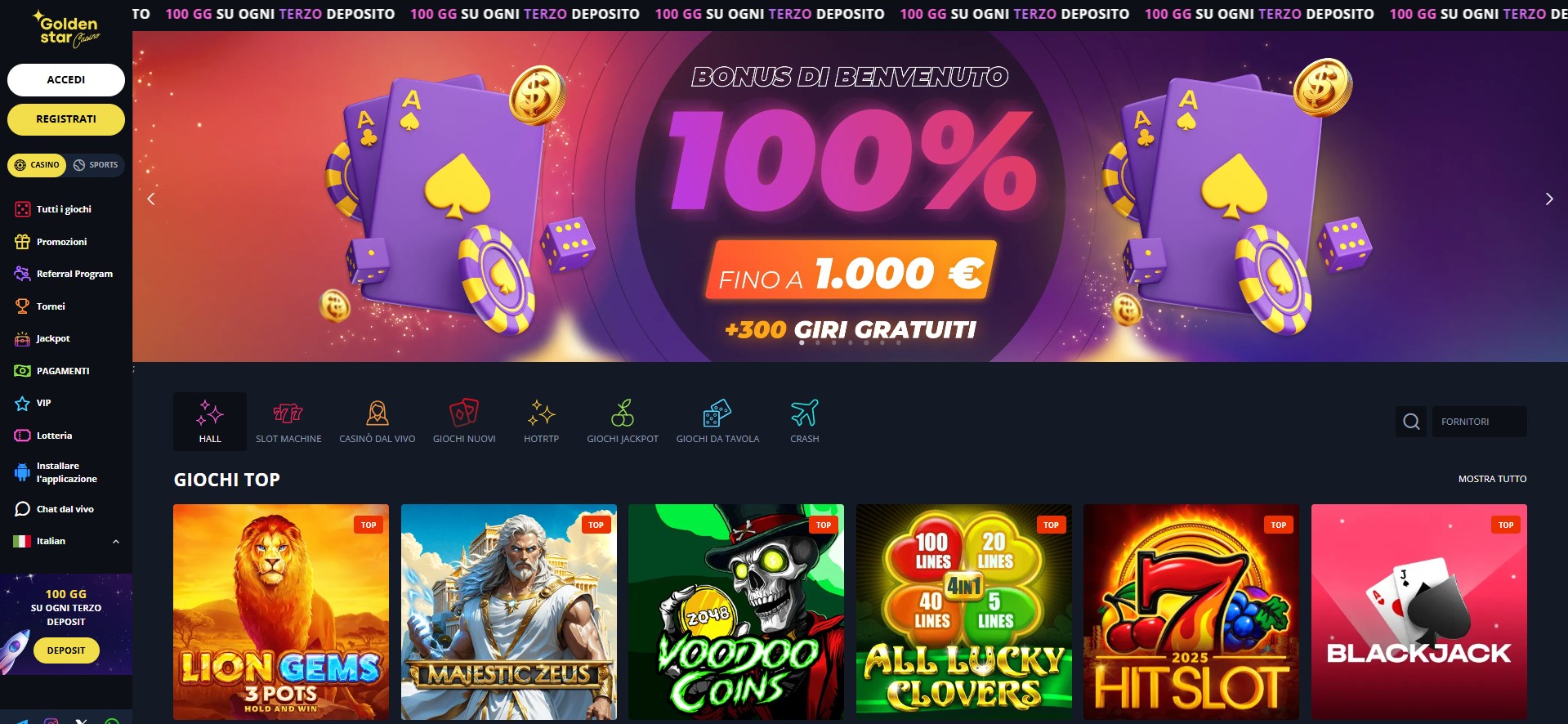 Golden Star si fa notare per l’impostazione moderna e un po’ diversa dal solito. È perfetto sia per chi ama il casinò classico, sia per chi preferisce usare le criptovalute. I depositi e i prelievi digitali sono veloci, e c’è davvero di tutto: slot, giochi live, tavoli e tornei che tornano regolarmente. Il sito è curato, aggiornato e piacevole da usare, con un design elegante ma semplice.