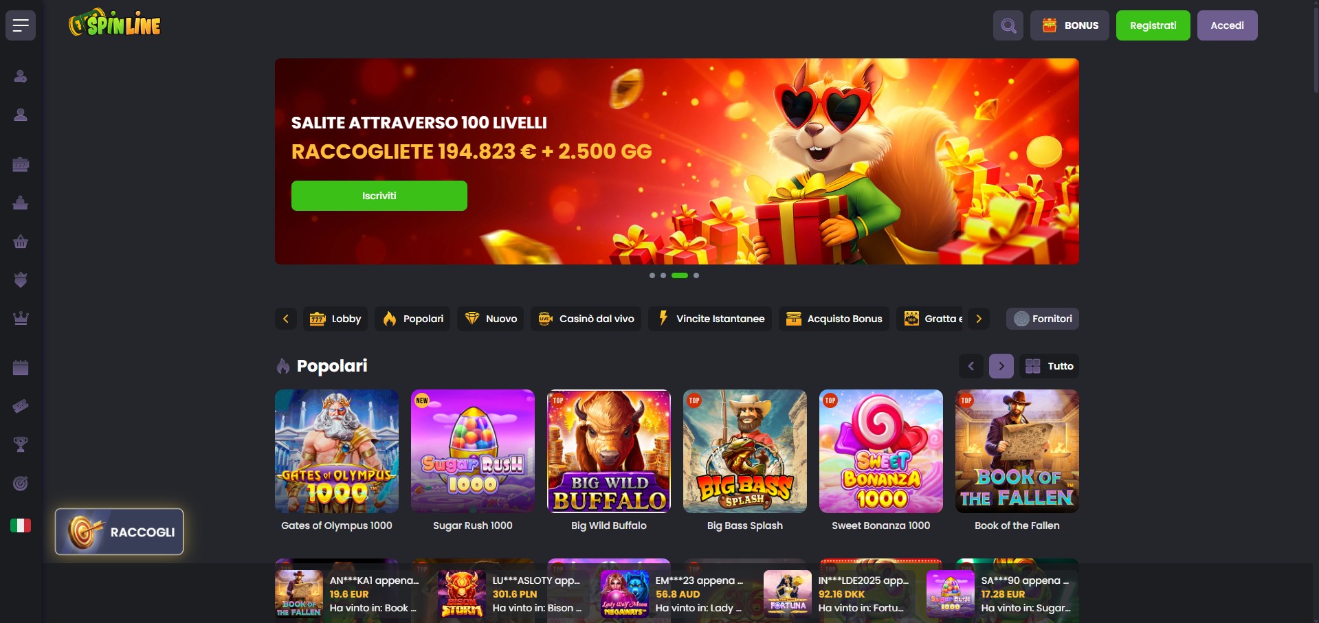 • Ampia varietà di giochi e provider — l’offerta è molto più ampia, spesso con giochi nuovi o esclusivi che non trovi nei cataloghi ADM. Ci sono slot, giochi da tavolo, live dealer e titoli di provider internazionali.