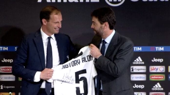 Agnelli e la maglia per Allegri: «Qualcosa che ti dobbiamo». Il regalo della Juventus al tecnico dei 5 scudetti consecutivi