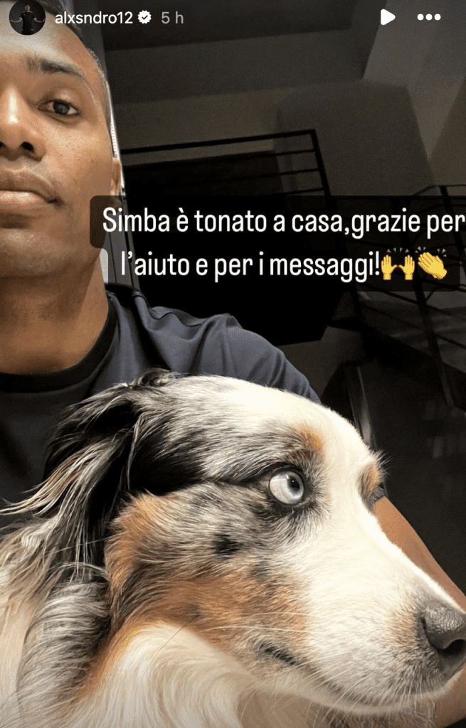 Disavventura dopo Torino-Juve per Alex Sandro, che sui social, verso la mezzanotte, aveva lanciato un appello per ritrovare il suo cane Simba, scomparso da casa.