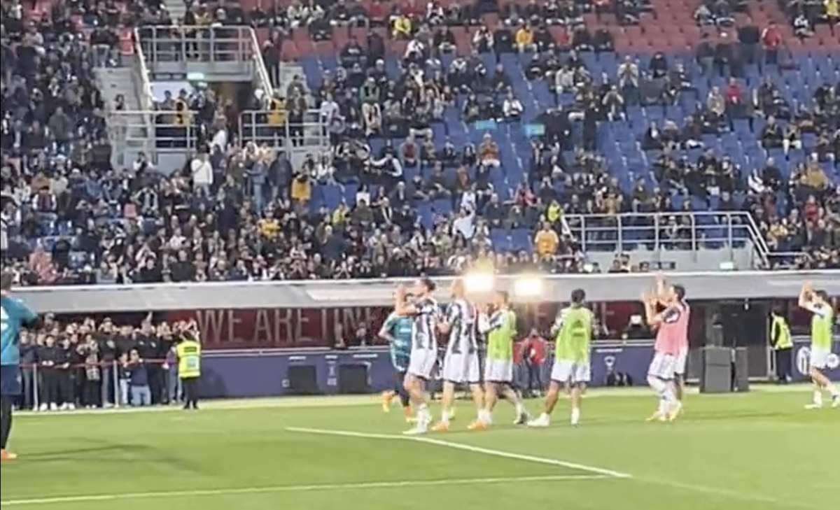 La Juve prima dell’inizio della partita contro il Bologna è andata sotto il settore ospiti per cercare il sostegno del proprio pubblico accorso numeroso al Dall’Ara.