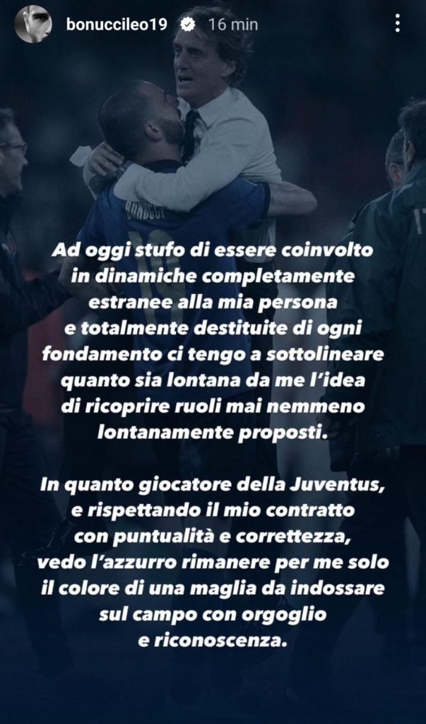 PAROLE – «Grazie Roberto Mancini per quanto abbiamo vissuto. Ad oggi stufo di essere coinvolto in dinamiche completamente estranee alla mia persona e totalmente destituite di ogni fondamento. Ci tengo a sottolineare quanto sia lontana da me l’idea di ricoprire ruoli mai nemmeno lontanamente proposti. In quanto giocatore della Juventus e rispettando il mio contratto con puntualità e correttezza, vedo l’azzurro rimanere per me solo il colore di una maglia da indossare sul campo con orgoglio e riconoscenza».