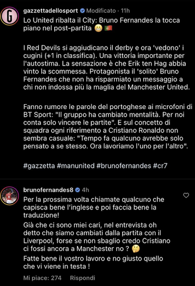 Bruno Fernandes non le manda a dire alla Gazzetta dello Sport. Il portoghese ha sbottato nei commenti sotto un post social in cui ci si riferiva ad una sua presunta frecciatina all’indirizzo dell’ex Juve Cristiano Ronaldo.