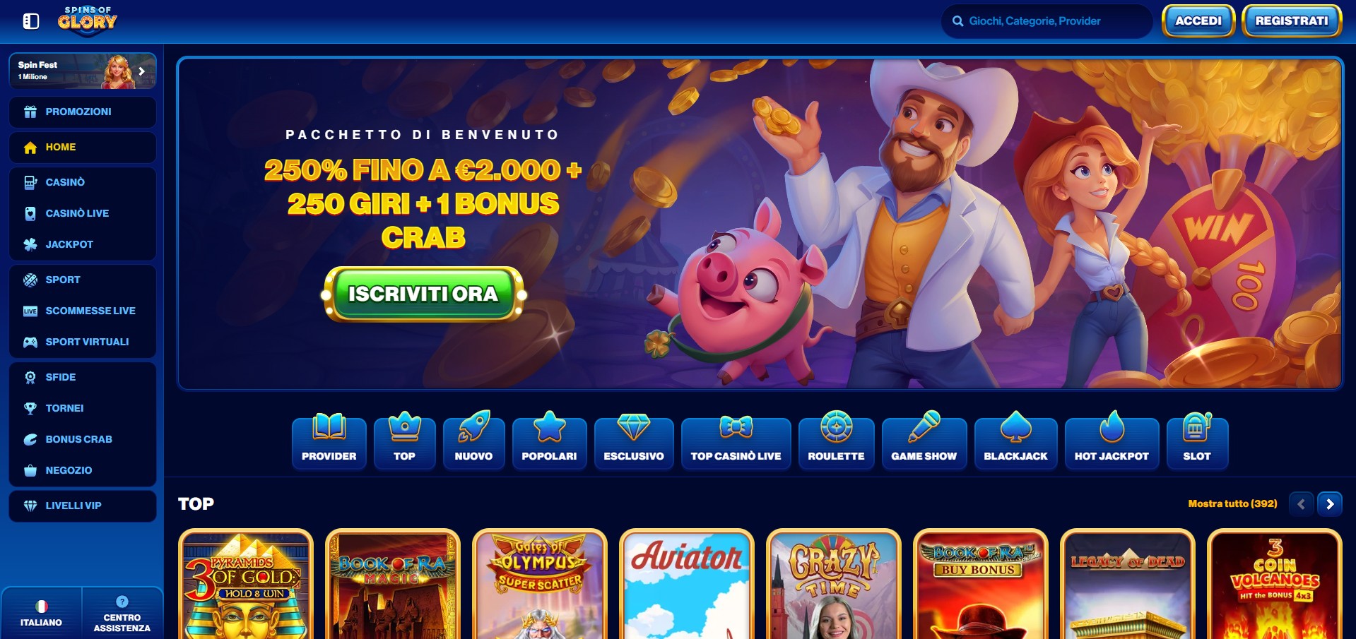 Spins of Glory è uno dei casinò non AAMS più completi e dinamici che ho provato di recente. Fin dal primo accesso mi ha colpito per la grafica colorata, la fluidità del sito e la facilità con cui si naviga tra giochi, promozioni e sezioni personalizzate. La piattaforma è ricchissima di contenuti: slot, giochi da tavolo, live casino, scommesse sportive e persino sfide giornaliere con premi. Il sistema di bonus è tra i più generosi in circolazione: oltre al classico pacchetto di benvenuto, ci sono cashback settimanali, un negozio premi e iniziative giornaliere sempre attive.