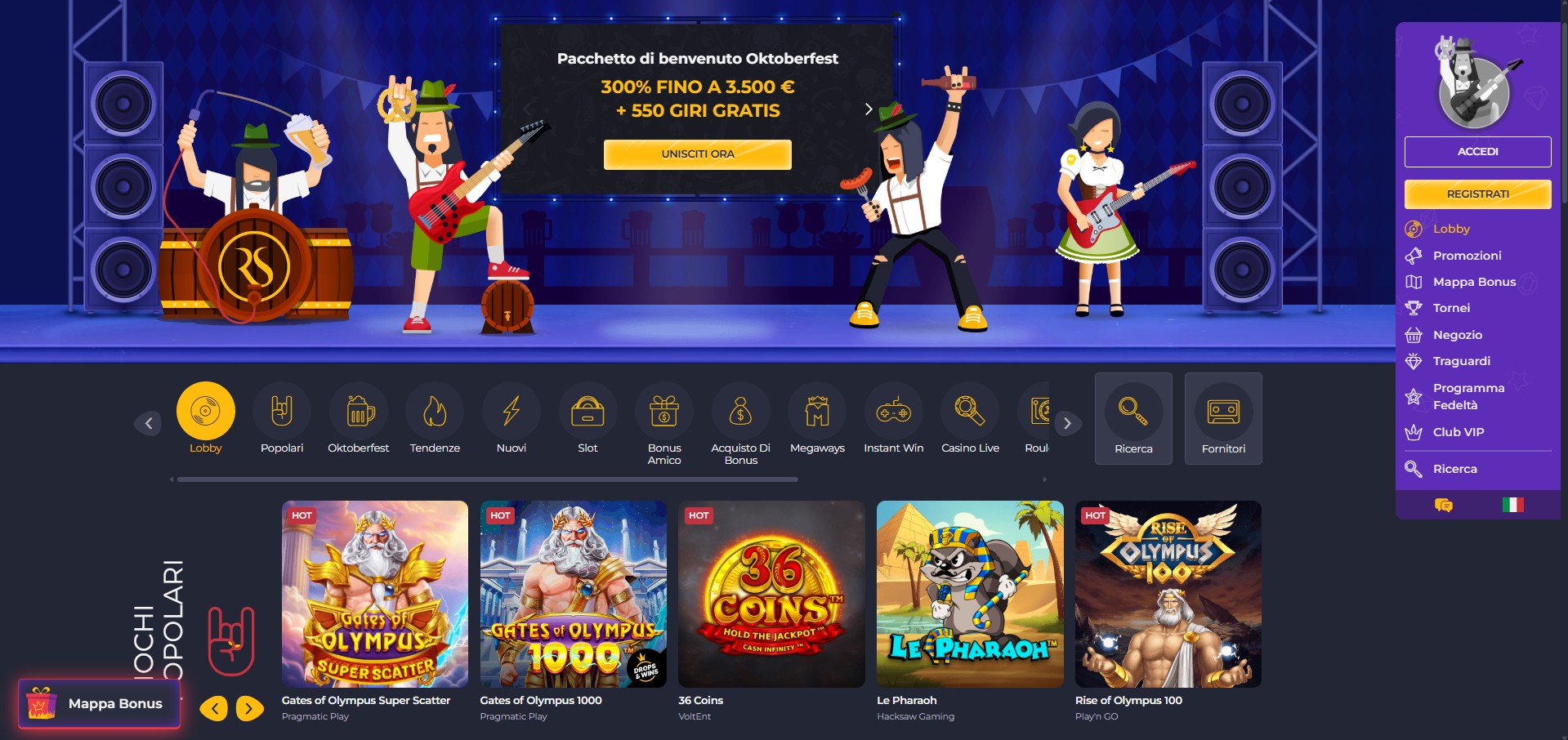 - Le slot sono organizzate bene per categorie e con filtri tematici, così trovi subito i giochi che ti piacciono;