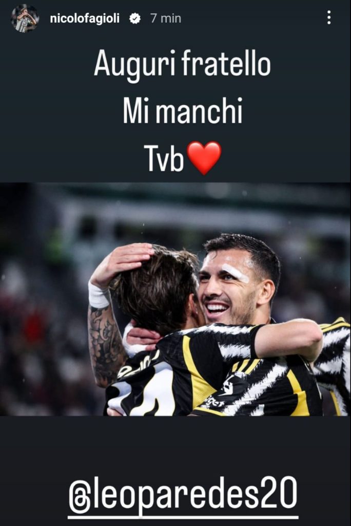 A lui ha voluto dedicare un particolare messaggio di auguri il giovane centrocampista Fagioli. Queste le parole che il bianconero ha scritto per Paredes attraverso una stories su Instagram: «Auguri fratello mi manchi Tvb».