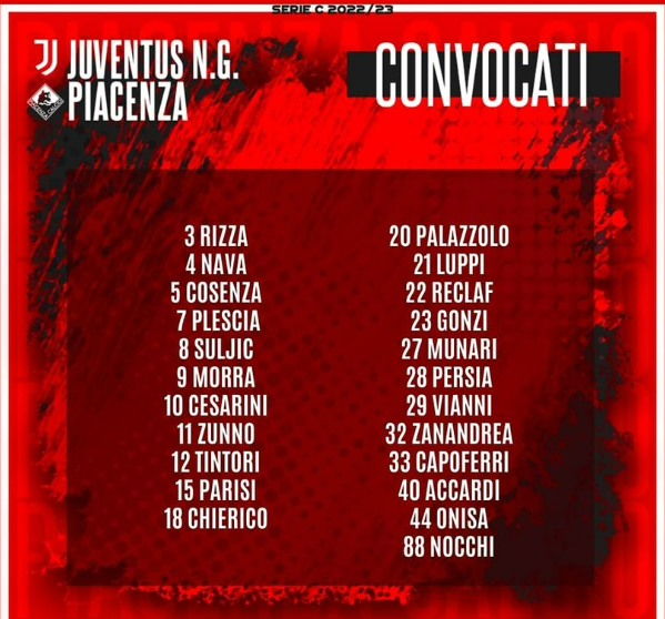 Attraverso i propri canali ufficiali, il Piacenza ha reso nota la lista dei convocati per il match di domani contro la Juventus Next Gen.