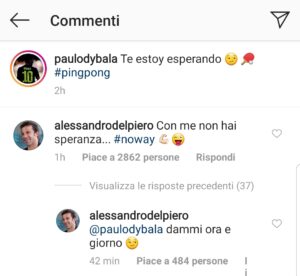 “Ti sto aspettando”, ha scritto in spagnolo la Joya. Un guanto di sfida raccolto subito da Del Piero, che ha subito risposto “Con me non hai speranza”. L’ex capitano della Juventus, poi, ha proseguito nella sua ‘rivalità’, chiedendo a Dybala ora e giorno per mettere in scena la loro competizione. Un divertente siparietto tra due numeri 10!