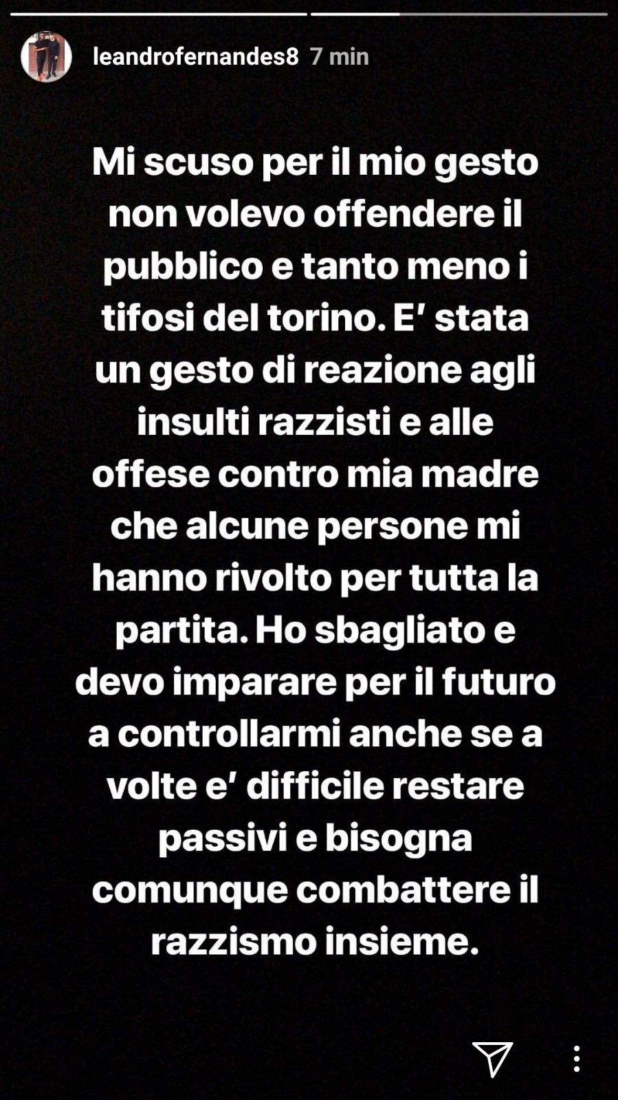 Sono poi arrivate, altrettanto puntualmente, le scuse del mediano bianconero, che ha fatto riferimento a presunti insulti razzisti rivolti nei suoi confronti. Così sulle sue Instagram Stories l’ex PSV: «Mi scuso per il mio gesto. Non volevo offendere il pubblico e tanto meno i tifosi del Torino. È stato un gesto di reazione agli insulti razzisti a alle offese contro mia madre che alcune persone mi hanno rivolto per tutta la partita. Ho sbagliato e devo imparare per il futuro a controllarmi, anche se a volte è difficile restare passivi e bisogna comunque combattere il razzismo insieme».