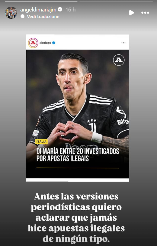 Anche Angel Di Maria, uno dei nomi nuovi circolati, prende posizione sulla riapertura del caso scommesse in Serie A. L’ex Juventus smentisce il suo coinvolgimento su Instagram. Queste le parole pubblicate sui social da parte del calciatore oggi in forza al Benfica.