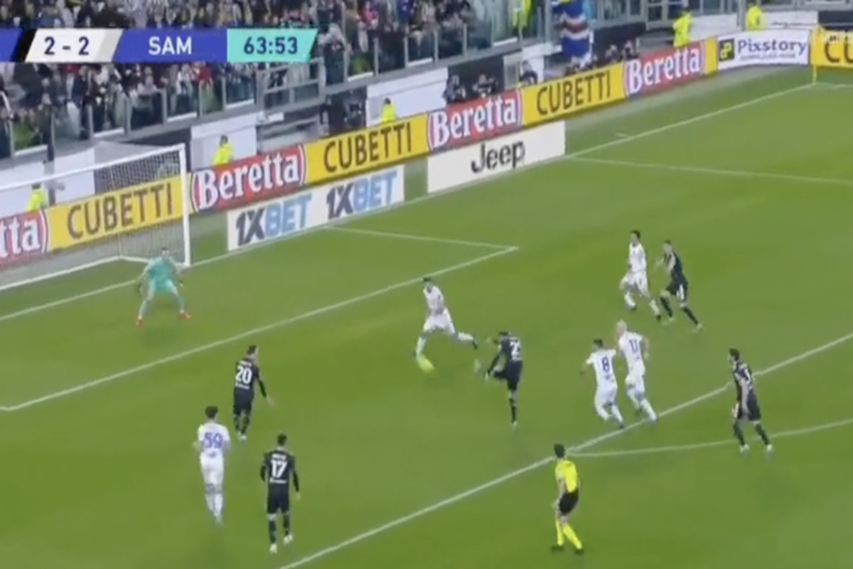 Ottima discesa e scambio con Fagioli, poi controllo (del quale gli avversari si sono lamentati per un presunto fallo di mano) e tiro al volo sotto il sette.