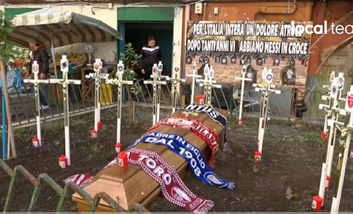 Lo striscione che accompagna il funerale comunica che: «Per l’Italia intera un dolore atroce. Dopo tanti anni vi abbiamo messi in croce».