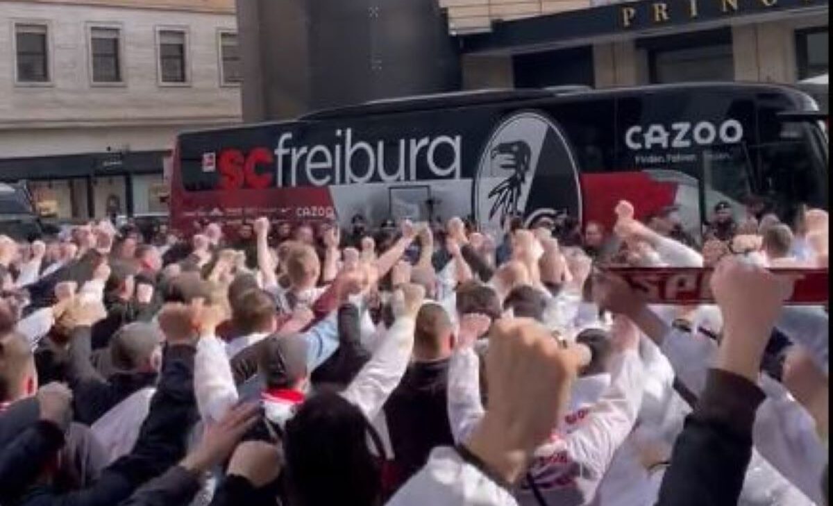 Il pullman del Friburgo è stato accolto dall’ovazione e dai cori dei tifosi in attesa davanti all’hotel di Torino dove la squadra ha alloggiato nella notte.