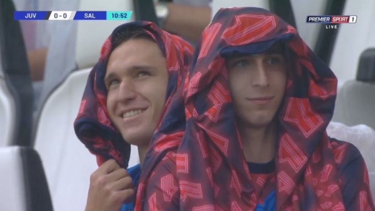 Tra loro ci sono Chiesa e Miretti che sono stati pizzicati dalle telecamere televisive mentre si proteggevano la testa dalla pioggia con alcune casacche. La foto è diventata subito virale sui social.