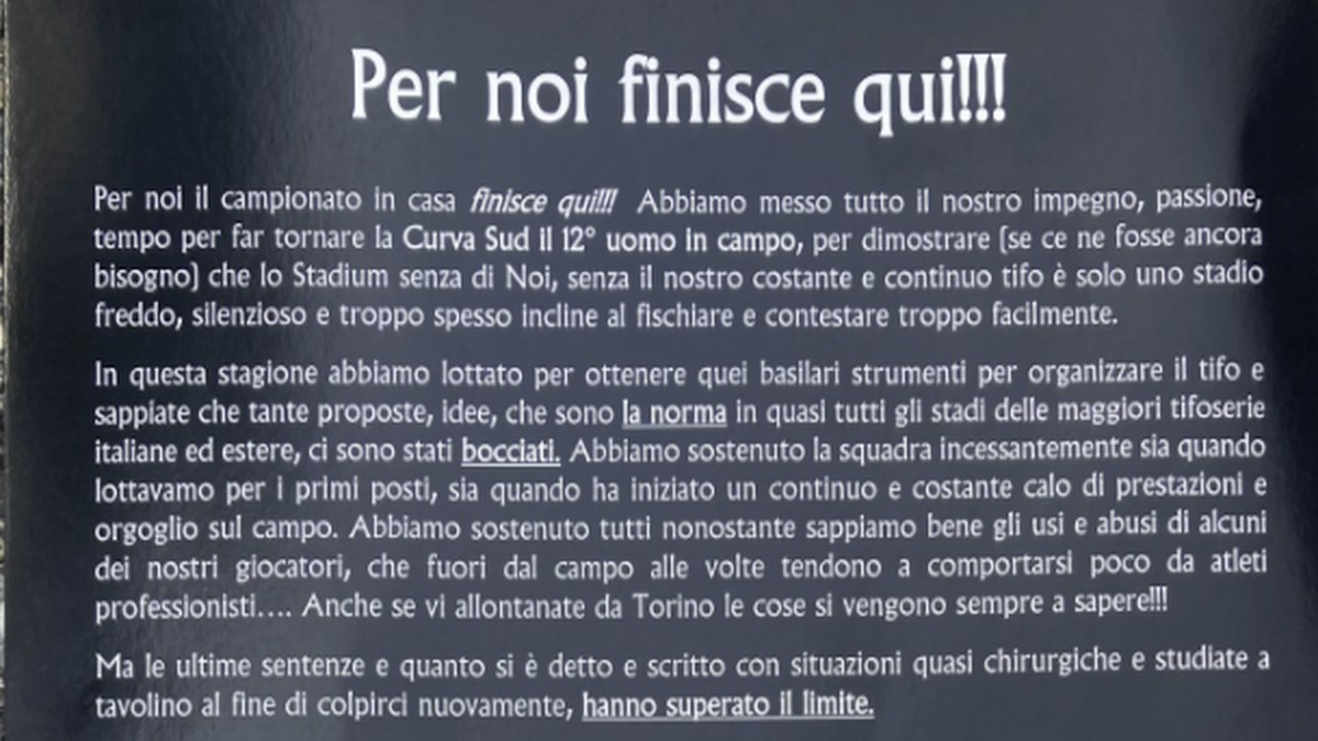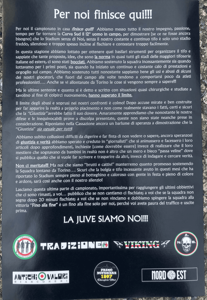Consegnati a tutti i tifosi della Juve presenti alcuni foglietti con il comunicato ormai noto, in cui si parla della volontà di questa frangia di sostenitori di non continuare a seguire dal vivo la squadra in questo finale di stagione.