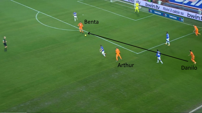 Una bella uscita della Juve, Arthur porta via l’uomo e Danilo trova Bentancur libero.