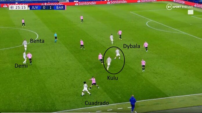 Nelle azioni sopra, si vede un pattern tipico del match di ieri. Per sviluppare l’azione, la Juve allarga il gioco su Cuadrado, con la manovra che però si blocca. Il Barcellona scivola bene in zona palla, il colombiano (che pesta la linea di fondo) non ha soluzioni di passaggio davanti a sé. I compagni e i mediani sono fermi, non c’è nessuno che venga incontro o aggredisce la profondità. Dybala e Kulusevski sono vicinissimi tra di loro e ben schermati dalle maglie rivali. E’ quasi impossibile arrivare a loro.