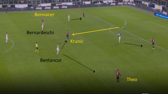 Gli abbassamenti di Krunic creavano infatti incertezza, come si vede nella slide sopra. L’ex Empoli si abbassa poiché Bennacer è marcato da Bernardeschi, per dare una soluzione di passaggio ai compagni. Bentancur si trova quindi in inferiorità numerica contro Krunic e Theo Hernandez, col Milan che riesce a superare la pressione avversaria. Queste difficoltà nel difendere in avanti hanno fatto tenere palla ai rossoneri molto più di quanto Sarri volesse.