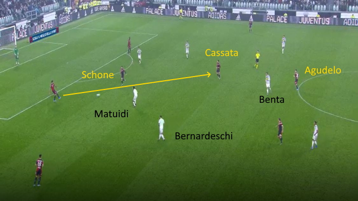 In fase di non possesso, la Juve come al solito si è disposta col 4312, con Bernardeschi alle spalle delle due punte. Il carrarino si trovava però in inferiorità numerica contro i due centrocampisti genoani, con Khedira che non sempre accompagnava la pressione coi tempi giusti. Il Genoa ha quindi impostato bene dal basso, disordinando col palleggio l’aggressione avversaria. Un esempio nella slide sopra, in cui la Juve è messa malissimo, con gli ospiti che approfittano del buco per vie centrali.