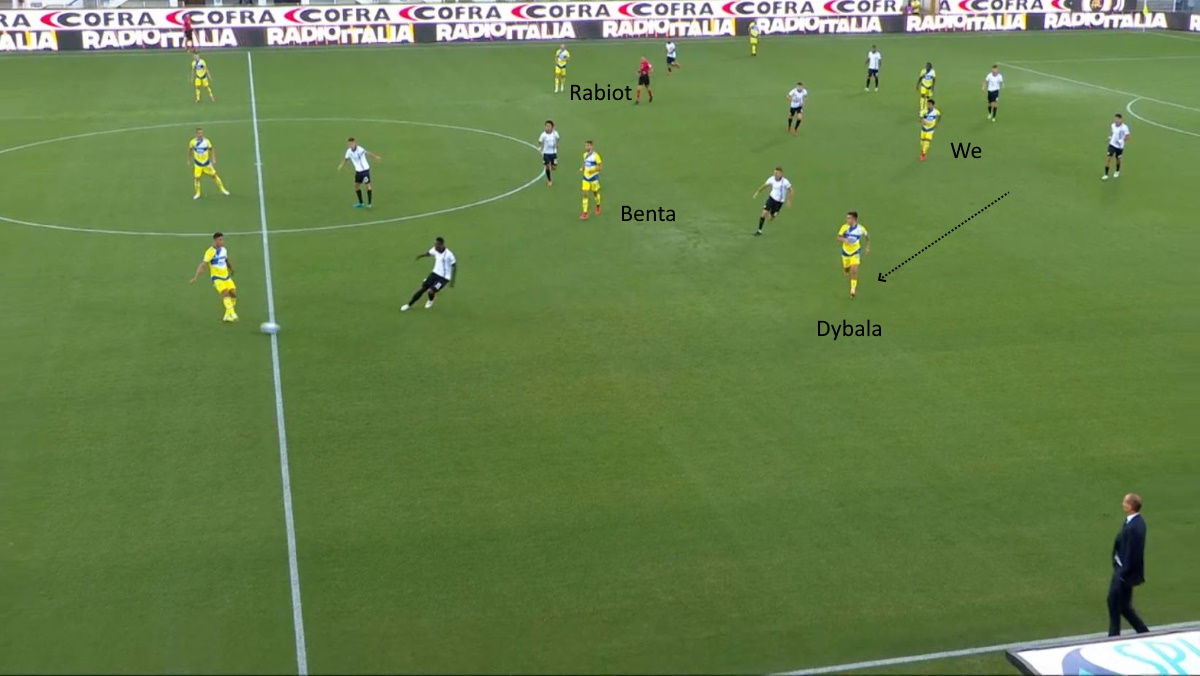 Due esempi qui, con la Juve molto statica. Nella prima slide, i giocatori sono lontani e nessuno dà una soluzione di passaggio a Danilo, che è costretto a lanciare lungo per un Dybala spalle alla porta.