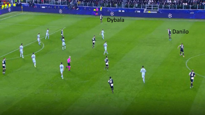 Con Danilo più bloccato, era spesso Dybala a occupare l’ampiezza a destra. Il brasiliano ha caratteristiche diverse rispetto a Cuadrado