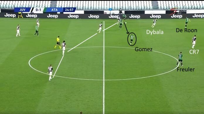 L’Atalanta non ha fatto alcuna difficoltà a consolidare il possesso, sfruttando la costante mobilità di Gomez. In avvio di azione, il Papu si abbassava sempre, era di fatto un centrocampista che agiva in mezzo a Freuler e De Roon. Nessuno leggeva i suoi movimenti, con la Juve che si trovava costantemente in inferiorità numerica in mezzo