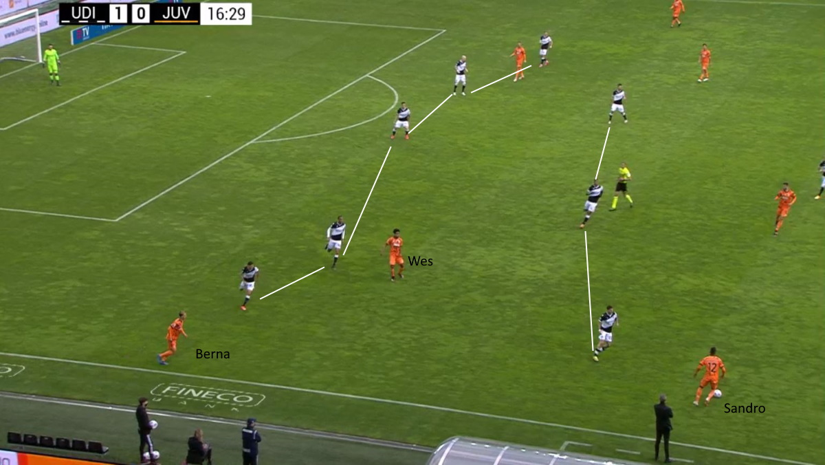 Alla luce delle caratteristiche dell’Udinese, la partita della Dacia Arena sarà anche un modo per testare le transizioni difensive della Juve. Soprattutto perché Allegri sta puntando su Ramsey davanti alla difesa, giocatore che potrebbe soffrire nelle ripartenze avversarie. Senza De Paul, sarà ancora più importante Pereyra, le cui ricezioni tra le linee potrebbero mettere in difficoltà il centrocampo della Juventus. Oltre che attaccare efficacemente contro un blocco basso, la Juve dovrà anche essere brava a riposizionarsi quando si perderà il pallone. Come abbiamo detto, i friulani attaccano soprattutto in ripartenza, quindi sarà molto importante la gestione delle transizioni.