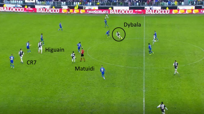 Per rimontare contro il Sassuolo, Sarri a gara in corso ha introdotto il tridente pesante, con Dybala dietro Ronaldo e Higuain (nel finale ha poi sostituito il Pipita con Ramsey). Non c’è dubbio che l’ingresso della Joya abbia cambiato la gara, con la Juve che ha acquisito molta più pericolosità e imprevedibilità in avanti. Contro un Sassuolo schiacciato dietro, la posizione tra le linee di Dybala ha costantemente consentito di far progredire l’azione, visto che CR7 e Higuain erano più statici in avanti.