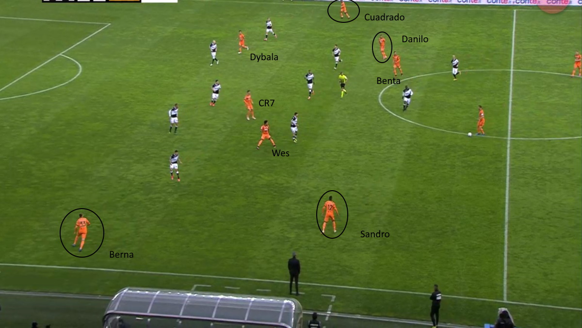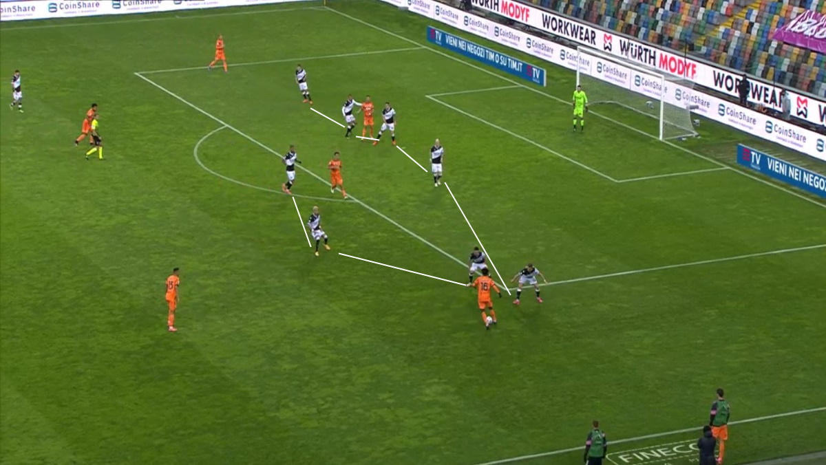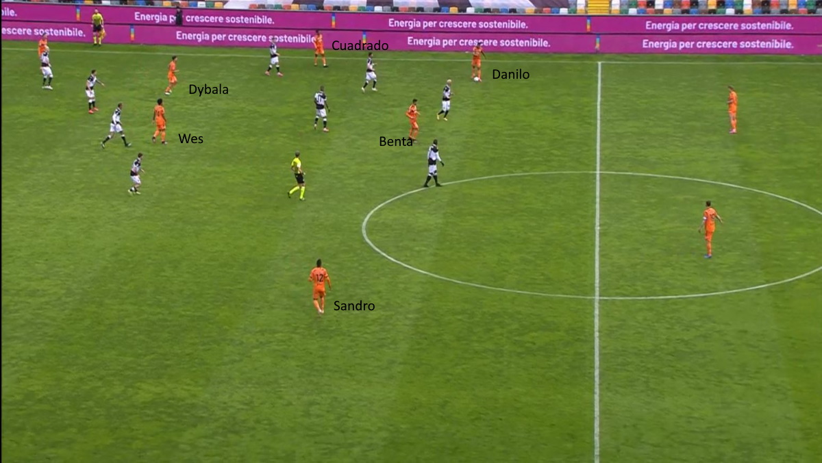 Come al solito, gli esterni della Juve ricevevano sempre da fermi e in inferiorità numerica: erano così costretti a ricominciare da dietro, con la manovra che si bloccava in fascia. L’Udinese era sempre in superiorità numerica in zona palla, la Juventus non riusciva a combinare sul breve e a trovare l’uomo libero.