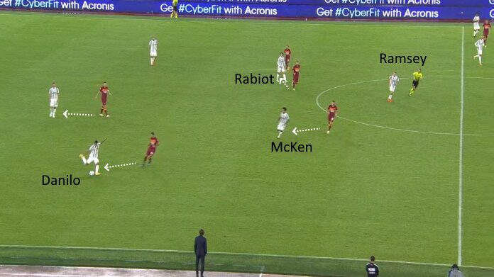Il rigore dei giallorossi, non a caso, è nato da un bruttissimo pallone perso nella propria trequarti. Curiosamente, in una delle rare circostanze in cui la Juve aveva provato a ruotare le posizioni: Ramsey si era abbassato davanti alla difesa, con McKennie che si sgancia in avanti. Tuttavia, il passaggio del gallese è lento e fiacco, con la Roma che quindi recupera palla.