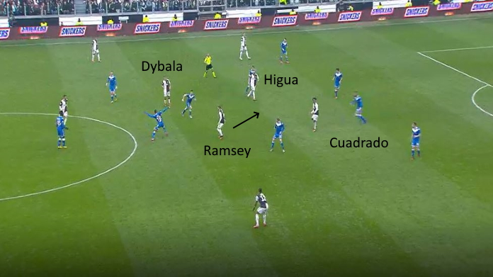 Tuttavia, il gallese continua a essere ancora impreciso tecnicamente, e dire che all’Arsenal svettava per le qualità in palleggio e rifinitura. Nei triangoli che si formavano, Ramsey era spesso imperfetto e maldestro nella misura del passaggio: a volte sbagliava proprio l’appoggio, altre volte ritardava l’azione con diversi tocchi di troppo. Nella slide sopra, per esempio, si fa ben trovare tra le linee: prova a servire di prima Higuain ma il passaggio è troppo lungo. Insomma, non è ancora molto pulito nel fraseggio con i compagni.