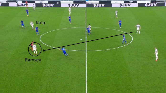 Si vede per esempio nella slide sopra. L’azione non si concretizza (l’ex Arsenal è in fuorigioco), ma va apprezzata l’intelligenza nel leggere la situazione. Con Kulusevski aperto alle spalle di Augello e Ronaldo che porta via il difensore, Ramsey è pronto ad aggredire la profondità. Con un pizzico di precisione in più, la Juve può mandare l’uomo in porta.