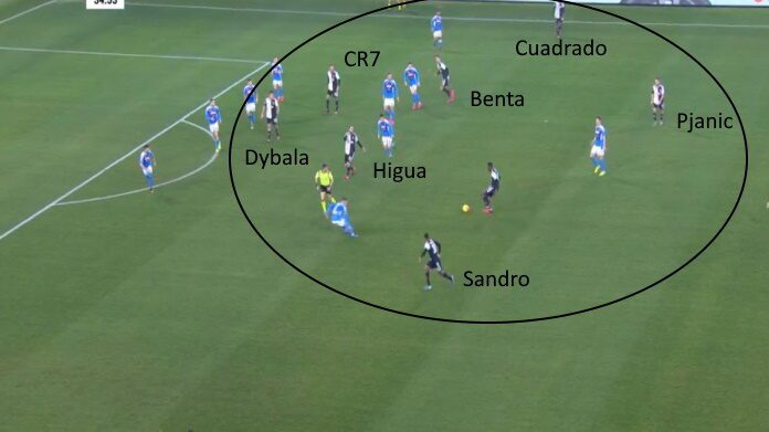 Si vede nella slide sopra. Il problema è che la Juve è mancata totalmente nella rapidità e nell’efficacia del giro palla, sostanzialmente non si è mai tirato in porta. Il baricentro molto basso del Napoli è stato efficace, con Insigne che spesso faceva addirittura il quinto in fase di non possesso. Insomma, se scegli di attaccare al centro facendo una tale densità, è imprescindibile un fraseggio veloce. Cosa non avvenuta al San Paolo, con le difficoltà di Matuidi sullo stretto che fotografano quelle della Juve. Parlare col senno di poi è facile, ma il 433 visto contro la Roma consente di coprire meglio il fronte offensivo. Vedremo su che strada insisterà Sarri.