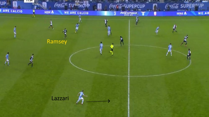 Proprio per questo, la pressione sul portatore deve essere fatta bene: come dice sempre Sarri, vanno evitate le situazioni di palla scoperta. Un esempio nella slide sopra. Si vede una Juve tutta concentrata a destra, con Lazzari (il quinto della Lazio) che ha tanto spazio sul lato debole. Il problema è che la pressione funziona male: Ramsey è in ritardo e Cataldi effettua con facilità un cambio di gioco sul lato sinistro bianconero. Bisogna cercare di essere più aggressivi in queste situazioni.