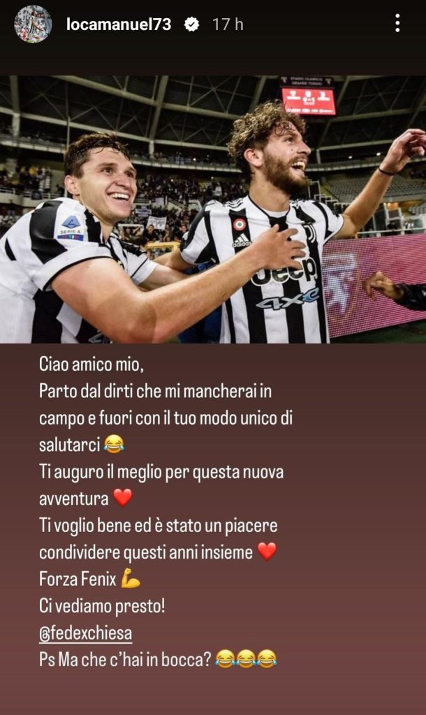 Anche Manuel Locatelli, sul proprio profilo Instagram, ha voluto salutare Federico Chiesa dopo l’ufficialità del trasferimento al Liverpool. Mi mancherai, è stato un piacere, è il messaggio del centrocampista bianconero per l’ex Juve: