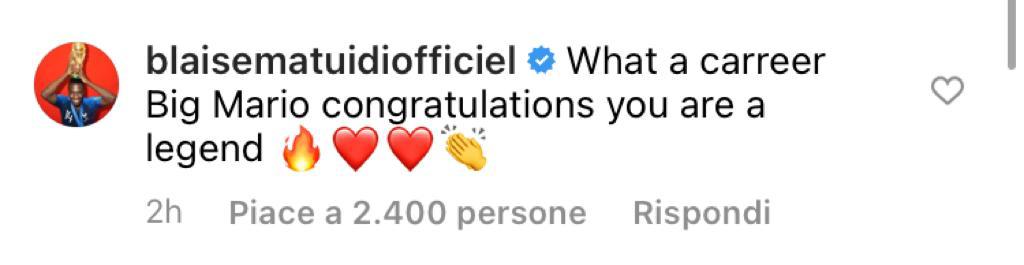 Tanti i messaggi ad omaggiare ‘Super Mario’, tra i quali anche il post su Instagram dell’ex compagno alla Juventus Blaise Matuidi: «Che carriera fantastica Big Mario, congratulazioni. Sei una leggenda».