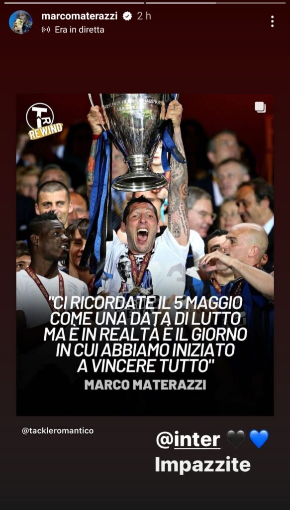 Con due stories condivise sul proprio profilo Instagram, Marco Materazzi ha voluto ricordare il 5 maggio in chiave positiva per i tifosi dell’Inter, ovvero tornando alla Coppa Italia del 2010 vinta contro la Roma, trofeo che ha dato il via al Triplete.