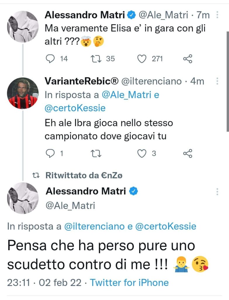 Tutto era partito da un tweet proprio dell’ex Juve: «Ma veramente Elisa è in gara con gli altri?». Da un lì un tifoso gli ha risposto così: «Eh ale Ibra gioca nello stesso campionato dove giochi tu». A quel punto Matri, capocannoniere bianconero di quel primo scudetto targato Conte, si è lasciato andare alla simpatica battuta.