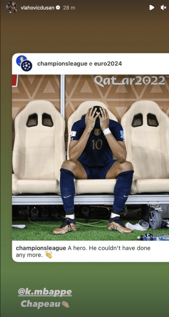 L’attaccante della Juve, attraverso una stories su Instagram, dedicato a Mbappé una sola, significativa parola insieme all’emoticon degli applausi.