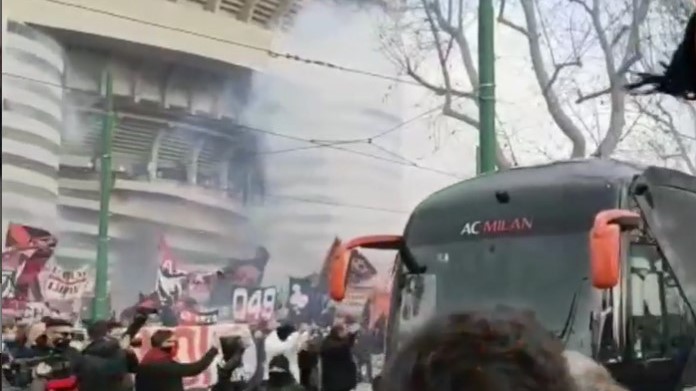 Una folla rossonera e nerazzurra ha accolto le squadre e i pullman: polemiche sui social e il paradosso degli stadi chiusi.