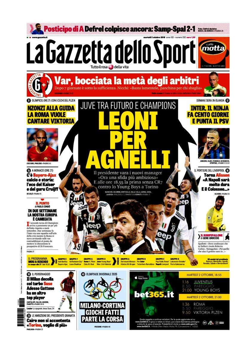 Rassegna Bianconera di martedì 2 ottobre 2018