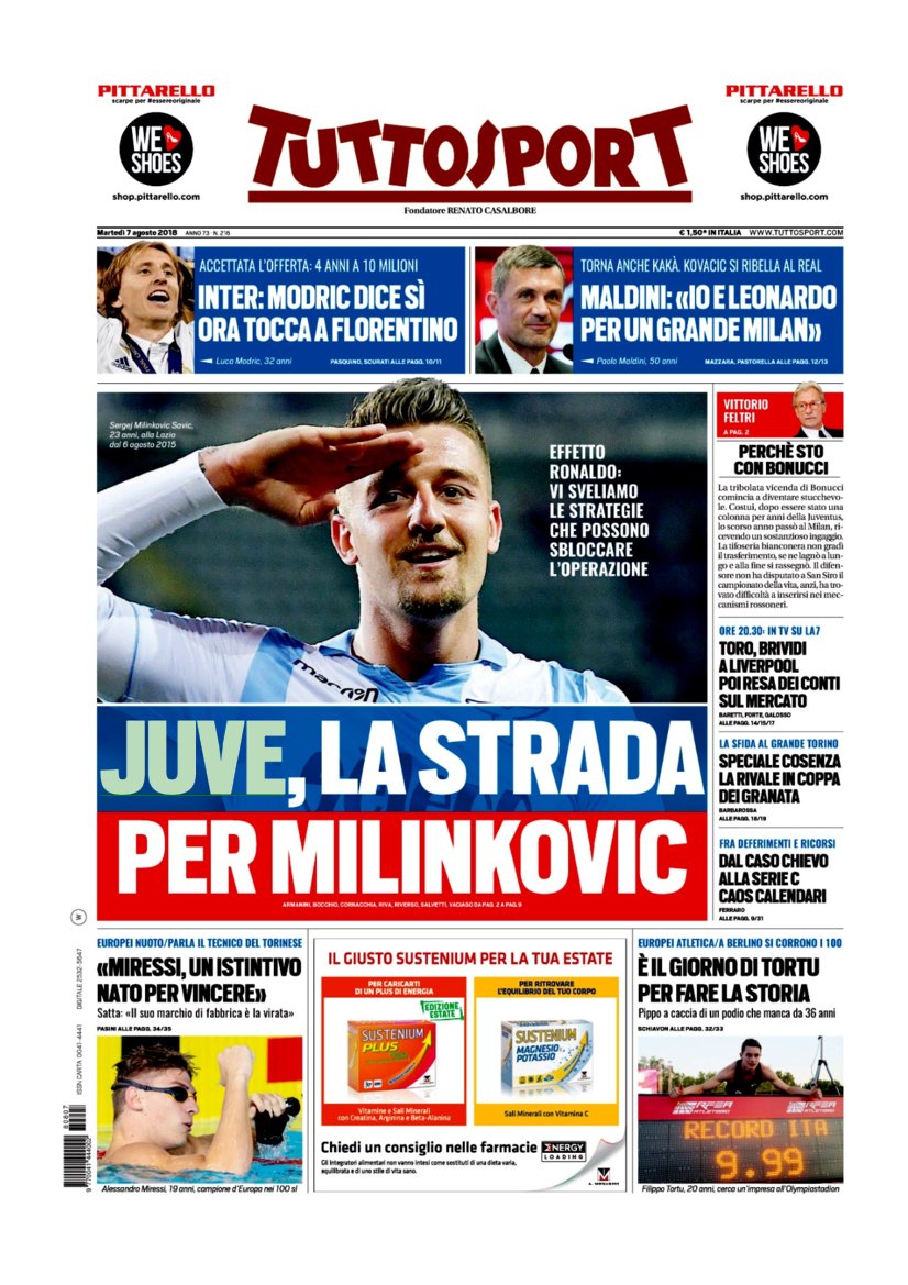 Rassegna Bianconera. Ecco le prime pagine dei giornali di martedì 7 agosto. Intrigante idea Pogba o Milinkovic per la Juventus