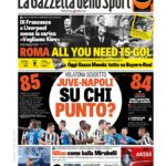 Juve-Napoli fino all’ultimo respiro – Si infiamma la volata scudetto. Capello: «I partenopei sono stati coraggiosi». Zoff: «Attenzione all’euforia» -Capita ogni tanto che un episodio, un’immagine, mi facciano capire il perché della grama vita della carta stampata. Io mi impegnerò sempre a raccontarvi cosa è successo domenica sera a Torino, in quello stadio che fino al passaggio del Napoli era ritenuto una assicurazione sulla vittoria. Il web bianconero è rovente. (Italo Cucci – Avvenire)