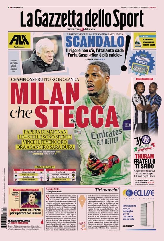 Le prime pagine di alcuni dei principali quotidiani sportivi internazionali in edicola giovedì 13 febbraio: in particolare risalto anche la Juve e la Champions League.