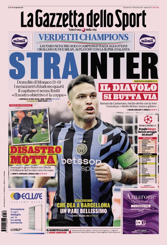 Le prime pagine di alcuni dei principali quotidiani sportivi internazionali in edicola giovedì 30 gennaio: in particolare risalto anche la Juve e la Champions League.