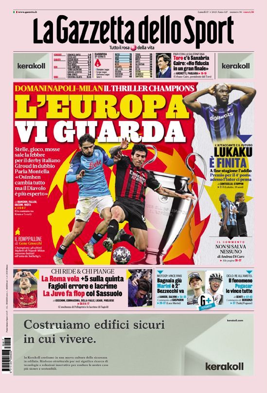 Le prime pagine di alcuni dei principali quotidiani sportivi nazionali ed internazionali.