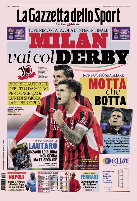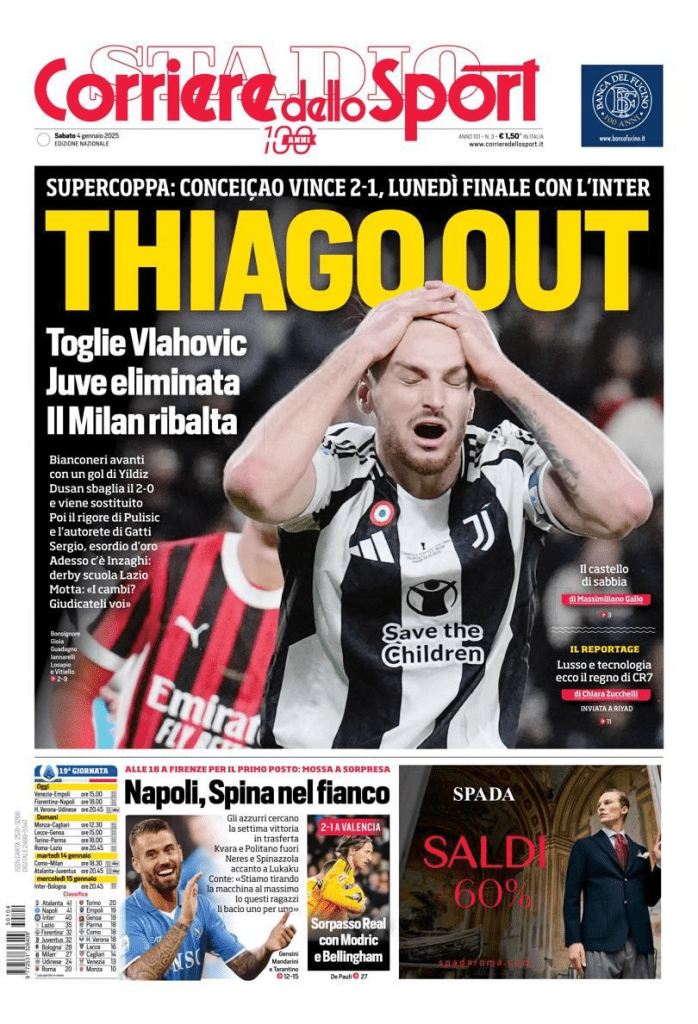 Le prime pagine di alcuni dei principali quotidiani sportivi internazionali in edicola sabato 4 gennaio 2025: in particolare risalto anche la Juve e la Supercoppa Italiana.