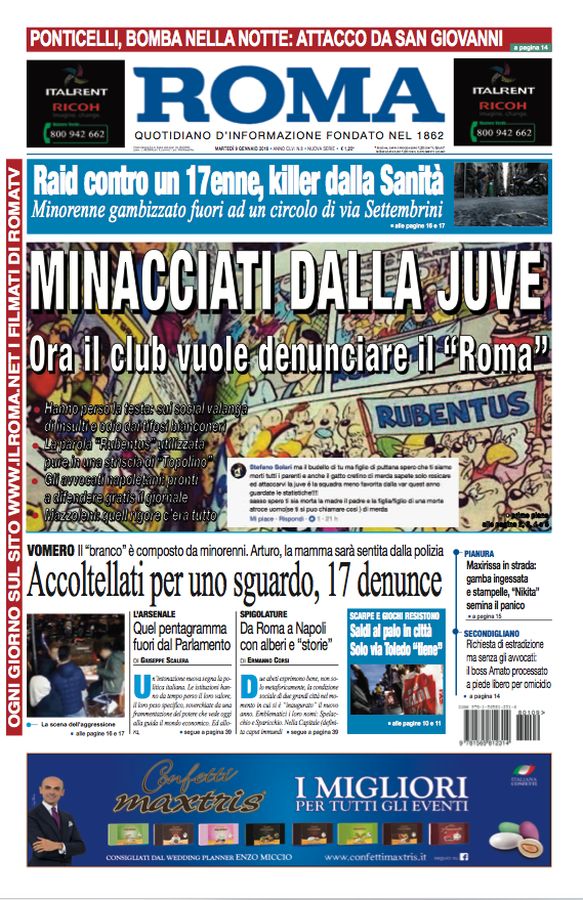 «Minacciati dalla Juventus». Altro titolo cubitale in prima pagina su il Roma, il quotidiano con sede a Napoli che aveva aperto l’edizione di domenica con parole discutibili: «In Fuga con la Rubentus». E naturalmente è scoppiato il polverone. Tant’è che il direttore Antonio Sasso si era scusato senza cercare particolari giustificazioni. Caso chiuso? Nemmeno per idea. La redazione napoletana infatti non riesce proprio a farne a meno e passa al contrattacco.